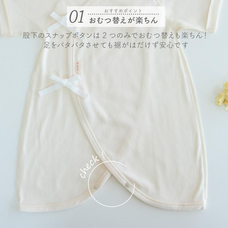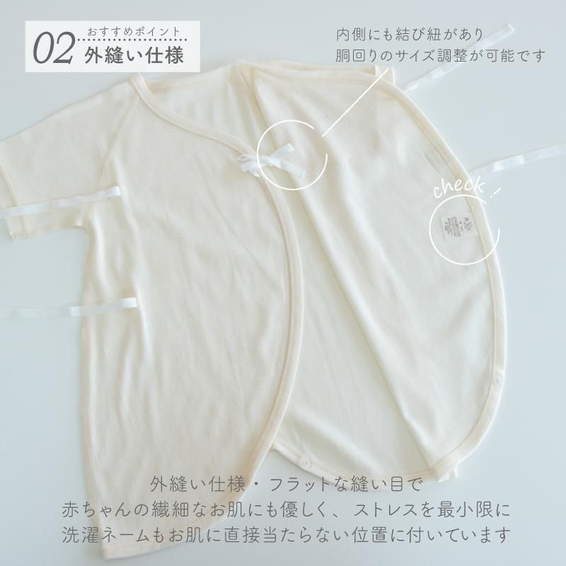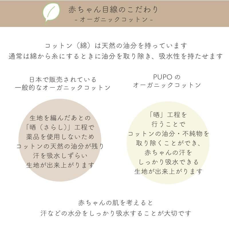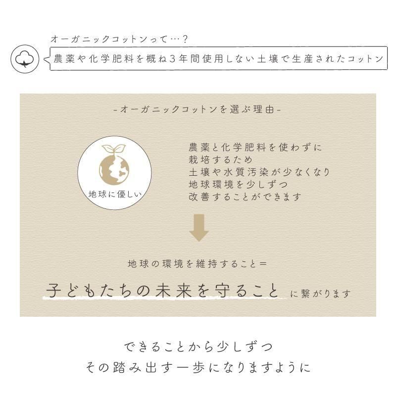 | おすすめ ポイント | ・汗をしっかり吸うために、不純物をしっかり取り除いたオーガニックコットンのフライス生地を使用しています。 ・すべすべの肌触りでいつでも気持ちよく過ごすことができます。 ・赤ちゃんの腹式呼吸の負担にならない、軽くて柔らかな素材です。 ・縫製糸も綿100%のものを使用しています。 |