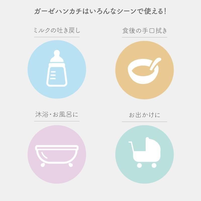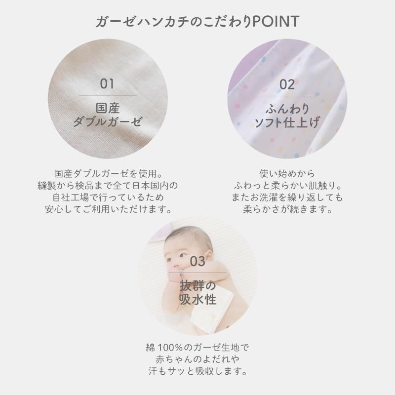 おすすめ ポイント | ・お肌に優しいやわらかガーゼハンカチです。 ・ふんわりソフトな肌触りの国産ダブルガーゼを使用しています。 ・普段使いに、授乳時や沐浴時等に、 ・様々なシーンでご使用いただけます。 ・何枚あっても便利なアイテムです。 |