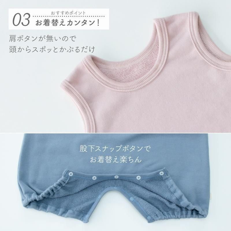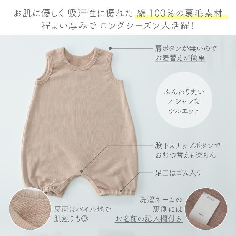 仕様について | ・肩ボタンが無いので頭からスポッとかぶるだけ!お着替えが簡単です。 ・股下にはスナップボタンが付いています。 ・足口にはゴムが入っています。 ・洗濯ネームの裏側にはお名前の記入欄付きです。 |