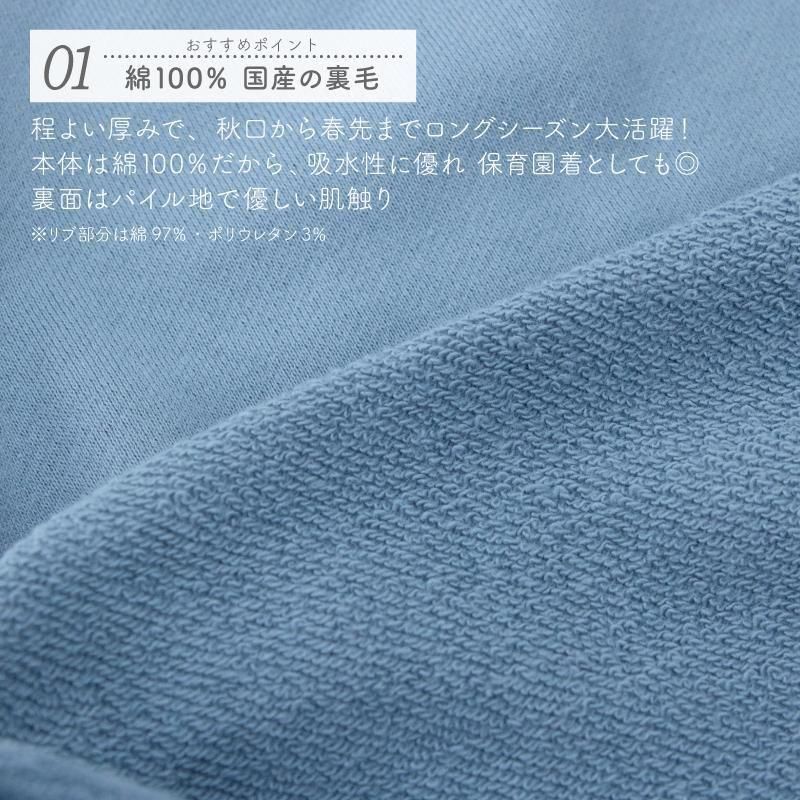 おすすめ ポイント | ・ほどよい厚みの国産の裏毛素材を使用しています。 ・本体生地は綿100%です。 ・適度な保温性があります。 ・ふんわり丸いおしゃれなシルエットです。 ・おしゃれなくすみカラーがかわいく、インナーを選ばないシンプルデザインです。 |